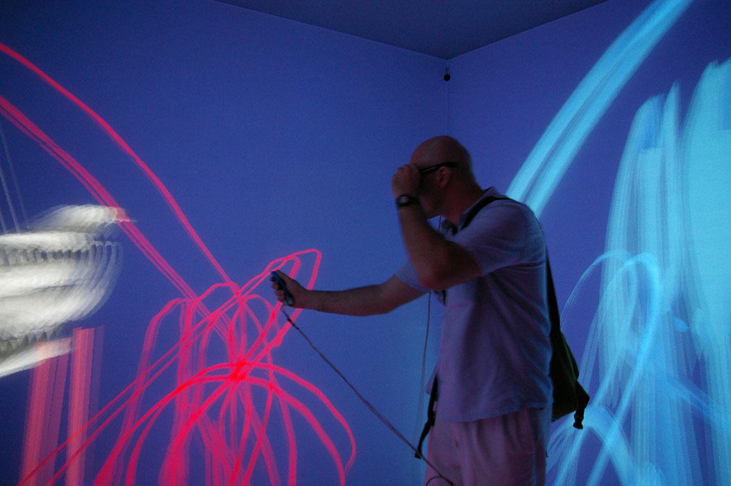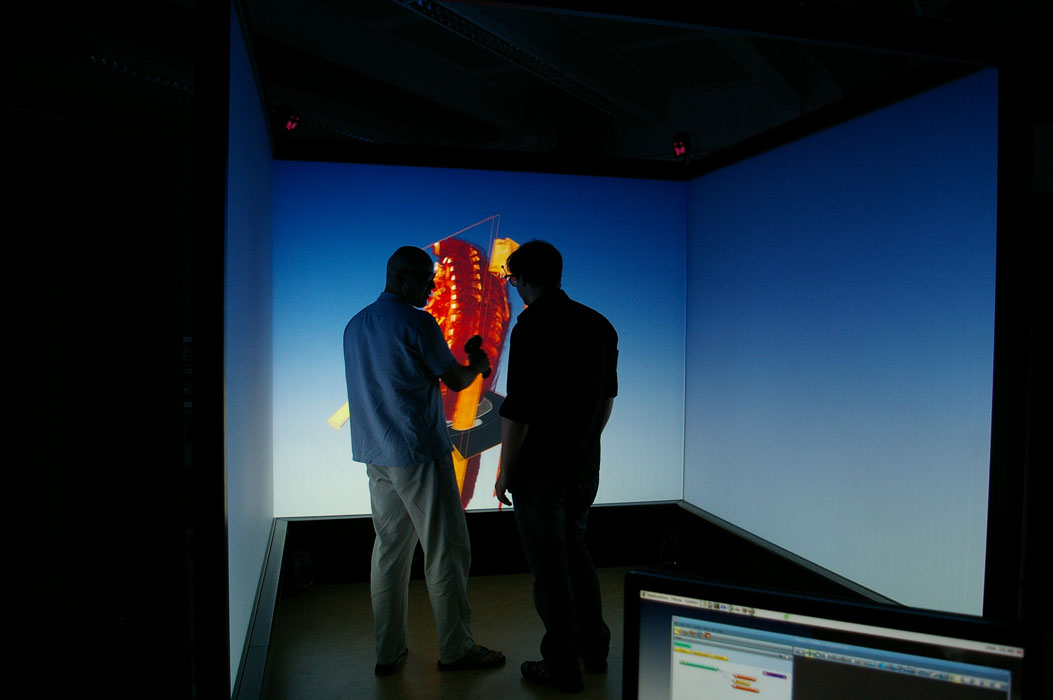 上の写真がIPK Fraunhoferのcave(モーションキャプチャー・スタジオ)。正面、上下左右の五面がスクリーンになっている。その中で、センサーを使って立体的な動きをデジタルデータ化できると同時に、映像を特殊なメガネで立体的に見る事ができる。センサーはPCのマウスの様に使用でき、3Dメガネをかけながら、空間に絵を描くことができる。