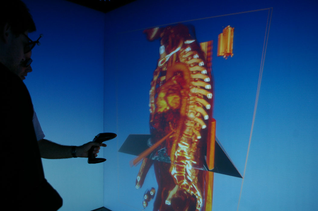医学を勉強しているそこのある研究員は人体の骨、血管、臓器、皮膚の立体的な映像をセンサーを使って回転させたり、分解したりして見せた。例えば臓器に腫瘍があった場合、写真だけでは奥行きなどの詳細が把握しずらいが、この技術があれば細かく見ていくことができる。
