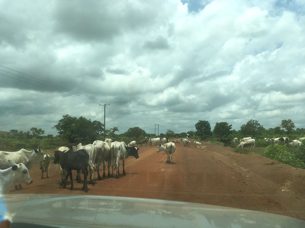 少し郊外に出ると、牛の群れが道路を占領。